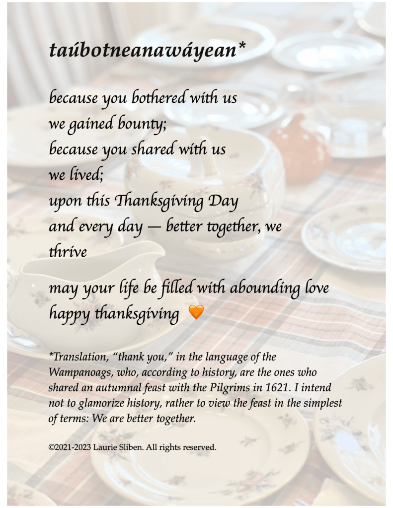 *Translation, “thank you,” in the language of the Wampanoags, who, according to history, are the ones who shared an autumnal feast with the Pilgrims in 1621. I intend not to glamorize history, rather to view the feast in the simplest of terms: We are better together. 🧡
