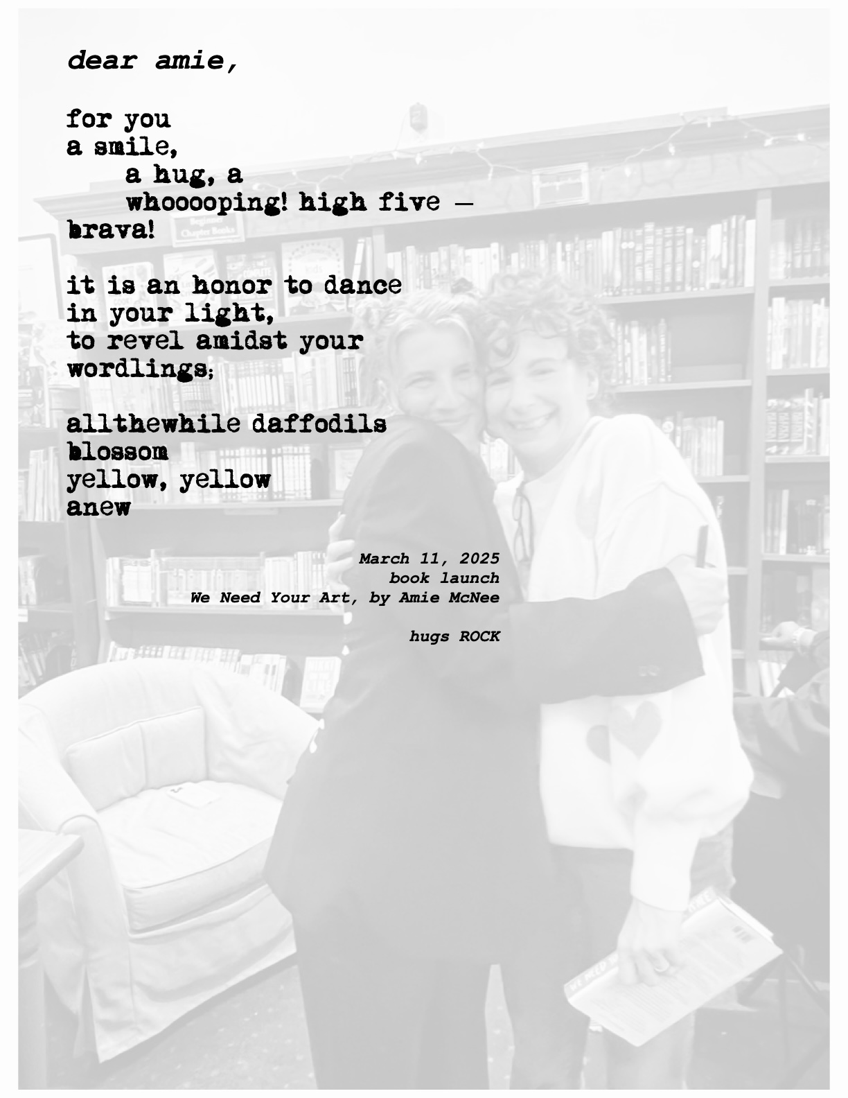 Below is an I’m-so-proud-of-you, teeny poem I shared back in March, for my dear teacher, Amie McNee, upon the release of her non-fiction book, We Need Your Art: Stop Messing Around and Make Something… also a tonic for the creative soul — however one defines creative. (I think simply being human puts us all in the “creative” category.) xo