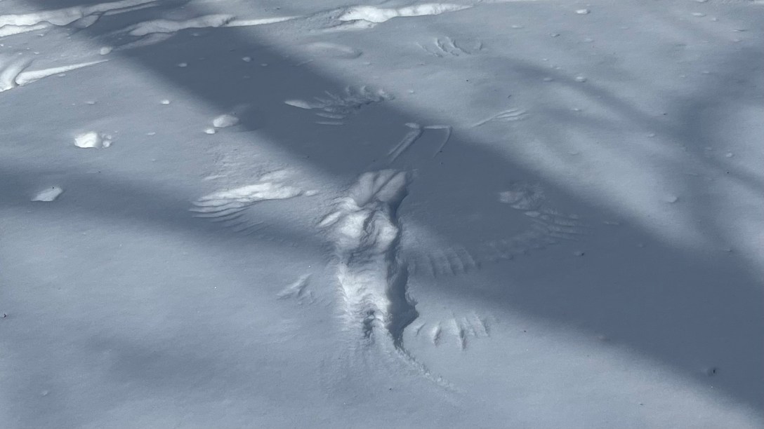 Do you see in the photo? What looks like pterodactyl prints in my front yard? They are actually crowwwwww prints. We’ve had so much snow, that when the crows – huge birds, that they are – land, then flap their wings, their wings make prints in the snow. This kind of stuff totally geeks me out.